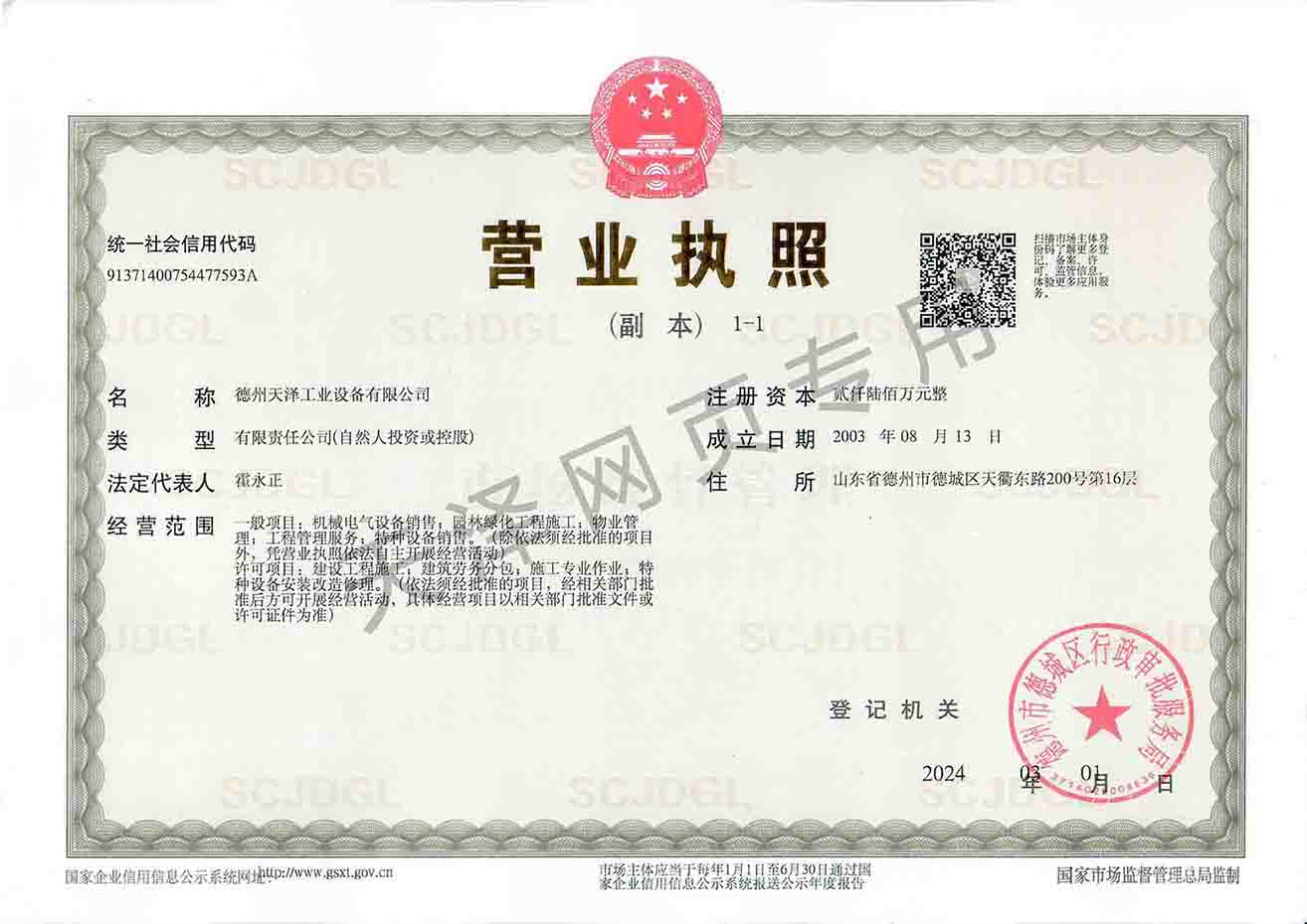 德州天澤工業設備有限公司成立于2003年(前身為德州天元集團天明工業設備安裝公司),經過20多年的發展,現成長為擁有職工600余人,各類專業技術人員近300余人,年生產能力兩億元以上,以建筑機電安裝工程、消防設施安裝工程施工為主,集建筑工程施工、市政工程施工、建筑智能化工程施工、園林綠化工程施工、工程管理服務、物業管理、電氣機械設備銷售等多元化經營于一體的綜合型企業。2005年,企業按照國際標準建立的質量管理體系,通過了ISO質量管理體系認證、環境管理體系認證、職業健康安全管理體系認證。施工工程遍布山東、河北、四川、江蘇等地,最具代表性的工程有:山東省德州市百腦匯資訊廣場機電安裝工程、德州經濟開發區天元大廈機電安裝工程、陵城區人民醫院機電安裝工程、德州金魯班大廈機電安裝工程、河北故城金辰小區機電安裝工程、北川地震災后援建工程等。多年來,公司始終堅持“以人為本,建精品工程,創行業品牌”的經營理念,先后榮獲省(市)級泰山杯、天府杯、魯安杯等獎項,申報各種功法、多項專利。